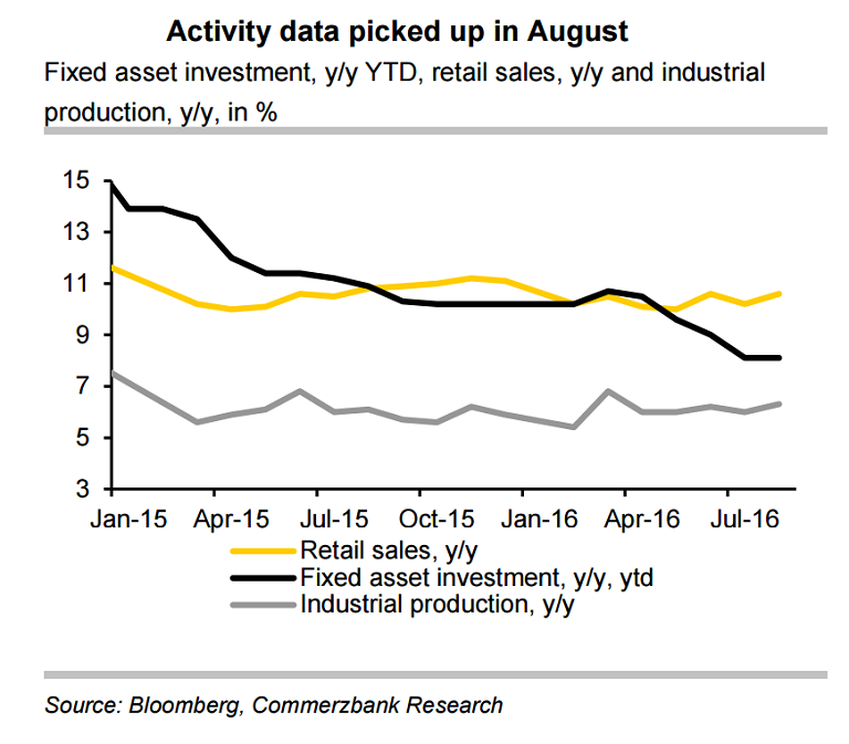 China's economy picked up steam in August, as demand rebounded on higher government spending and a year-long credit and property boom. China’s August activity data which came in stronger than expected, following a set of weak data points in July suggest that China’s economy is stabilizing.