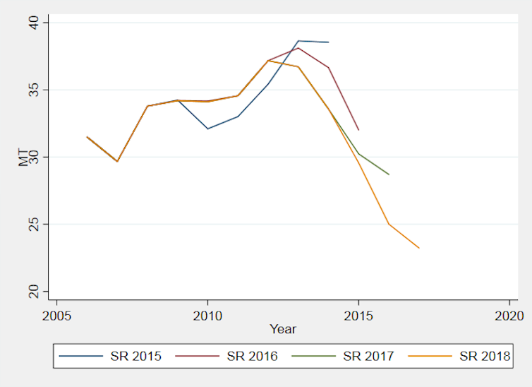 SR = BP Statistical Review of World Energy; MT = millions of tonnes. BP Statistical Reviews 2015-18