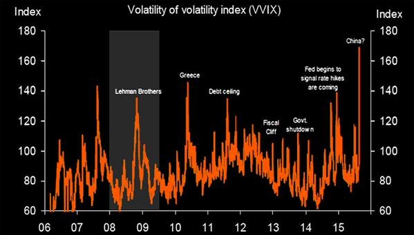 The above chart shows that VVIX index (volatility of VIX index) rose to record, over current market turmoil, thanks to China, whose economic concern has created massive headwinds for global economy.