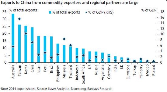 The chart from Barclays research shows, some countries have additional vulnerability to China's hard landing, given their still high exposure to China via exports to the country.