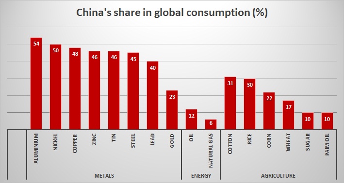 - China is consuming significant portion of world production of Aluminium (54%), Nickel (50%), Copper (48%), Zinc (46%), Tin (46%), Steel (45%), Lead (40%), and Gold (23%).
