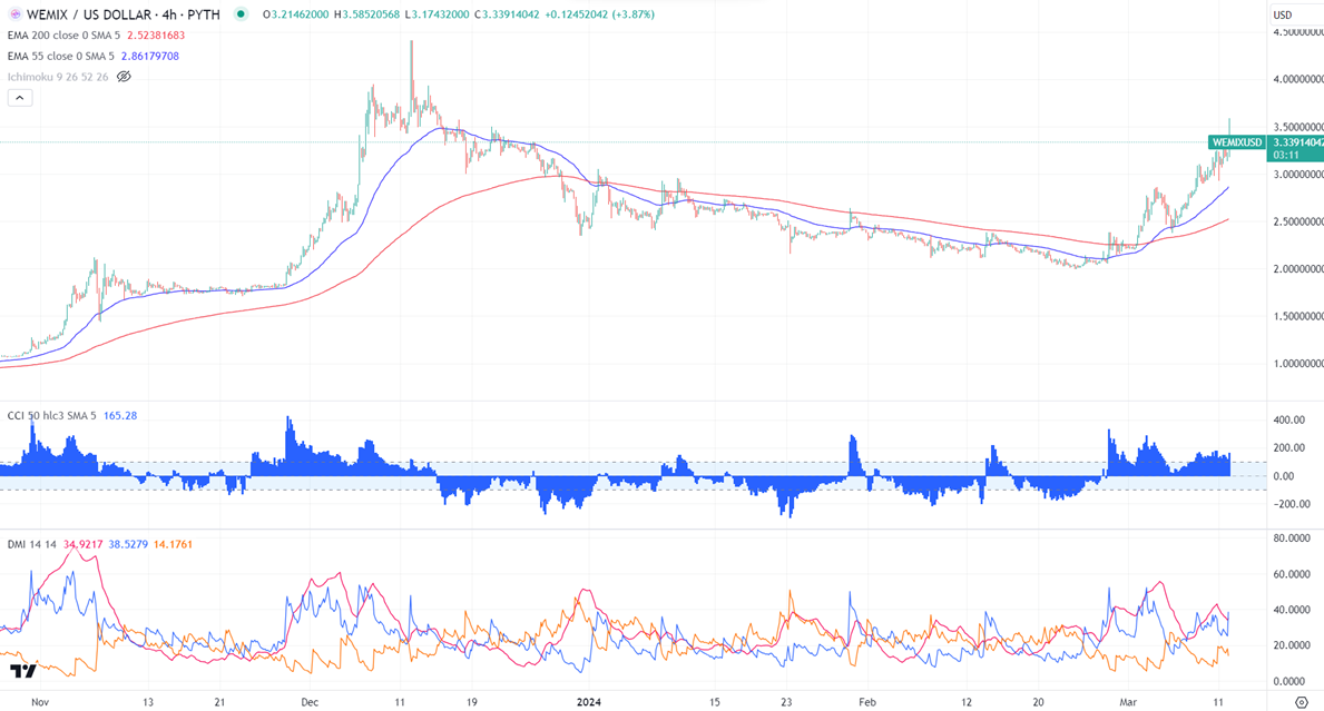 WEMIXUSD surged more than 75% in the past two weeks. It holds above the short-term (21 and 55 EMA) and above the long-term moving average. It hit a high of $3.58 and is currently trading around $3.380.