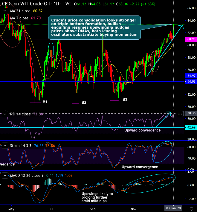 The global crude oil prices have regained buying sentiments of-late, with Brent and WTI crude futures seem to have been staged for 5th consecutive week’s gains after the recent lows of $56.17 levels, it has risen from $44.37 (2019 lows) to the recent highs of $64.05 level (surged 35.13% in the last year), and with the 2019 lows of 55.90 levels Brent crude has rallied about 21.90% and continued the bullish streaks.