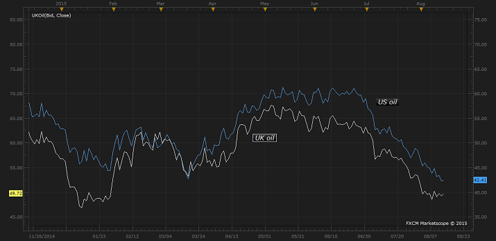 Today WTI dropped to new six year low since the rout started 14 months ago, in June 2014. WTI CFDs (contract for difference) traded as low as $39.55/barrel.