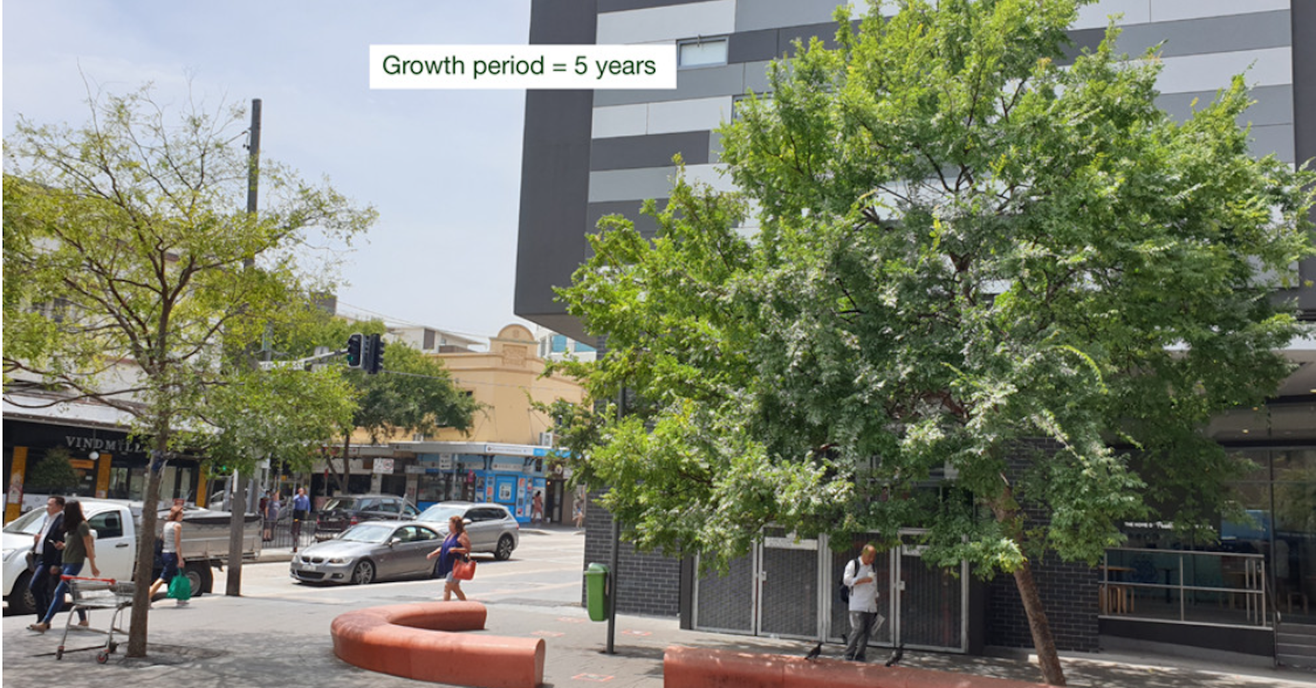Trees planted in specialised soil volume systems grow much faster, as do trees with proper access to water. In this trial, the tree on the right was planted in a soil vault, while the tree on the left (planted at the same time) was not. CityGreen