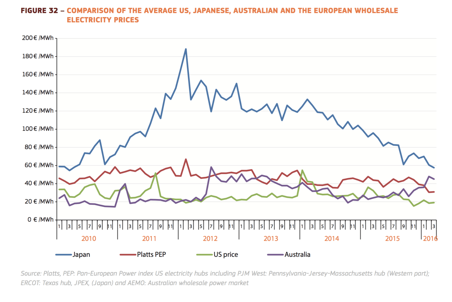 Australian prices are now above European prices, well above the US prices and rapidly converging with Japan, which is still recovering from the shock of Fukushima in 2011 when prices rose to over eight times Australian.