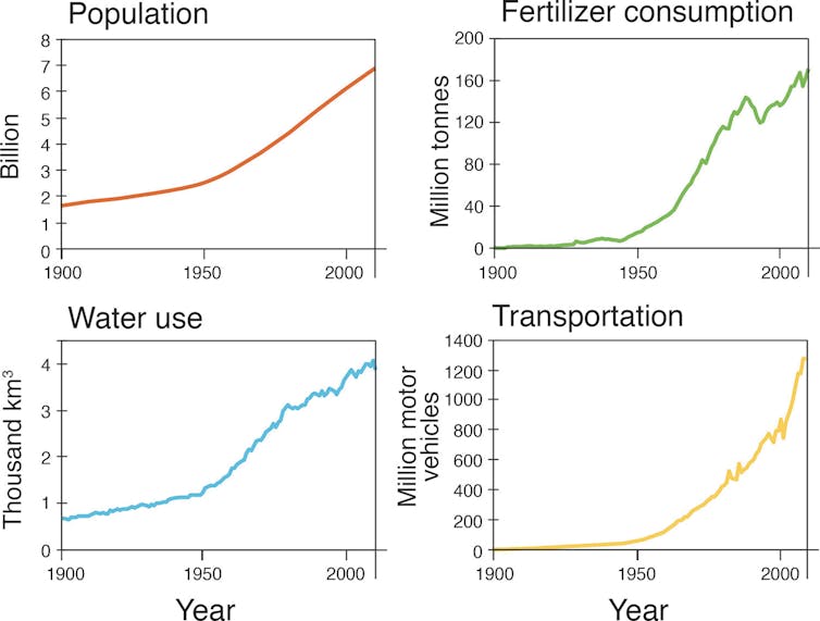 Increase in human population, fertiliser use, water consumption and vehicle ownership in the world since 1900. Maslin & Lewis, Author provided