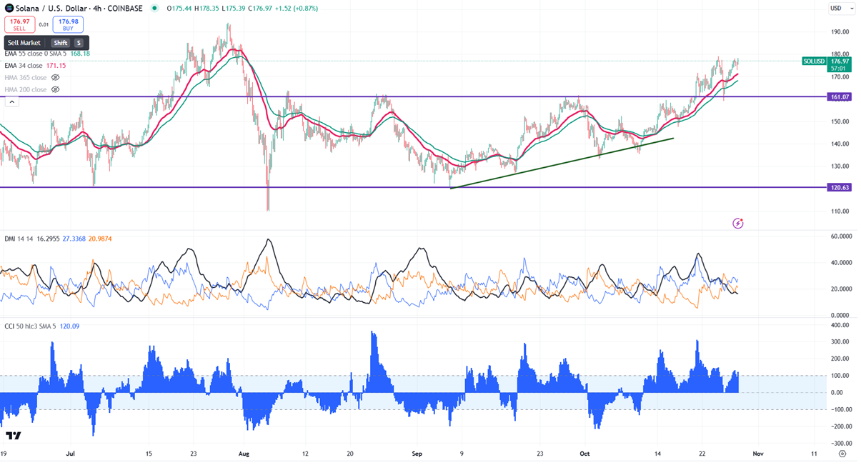 Currently, SOL has broken through the key resistance level of $165 and is trading around $178, with strong resistance at $180. If it remains above this point, it may climb further to $200 and beyond. However, if the price closes below $110, it could indicate a bearish trend. The nearest support level is at $160, and a drop below that could target $140, $127, $120, or $110.