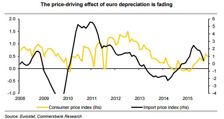 "We still expect the core inflation rate to be below, rather than above, 1% in the coming year too. The clear rise in the core inflation rate expected by the ECB so far to an average of 1.4% next year has become even more unlikely with today's data. We anticipate that the ECB will correct its forecast for core inflation downwards tomorrow and use this downward revision as grounds for deciding on further expansionary measures", says Commerzbank in a research note.