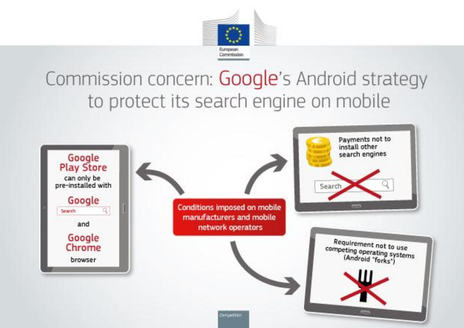 Google, the commission argues, violated EU rules by requiring manufacturers to pre-install Google Search and its Chrome browser and obliging them to make Google Search a default search service as a condition of being granted a license for Google’s proprietary apps, particularly the Play Store app which is the key marketplace for Android-compatible apps.