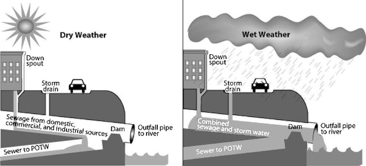 During dry weather (and small storms), all flows are handled by the publicly owned treatment works (POTW). During large storms, the relief structure allows some of the combined storm water and sewage to be discharged untreated into an adjacent water body. EPA
