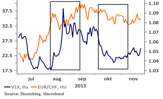 The Swiss franc is not the first choice as a safe haven for investors anymore. During the tensions stemming from China, the Swiss franc remained comfortably above the 1.08-handle. More recently, after the terror attacks in Paris, the Swiss franc even weakened vis-à-vis the euro and the dollar. In fact, the correlation with a volatility index such as the VDax has become positive, indicating that bouts of volatility will result in a weakening of the Swiss franc.