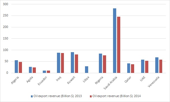 - In 2014, OPEC (excluding Iran) earned about $730 billion from oil revenue, 11% lower than 2013.