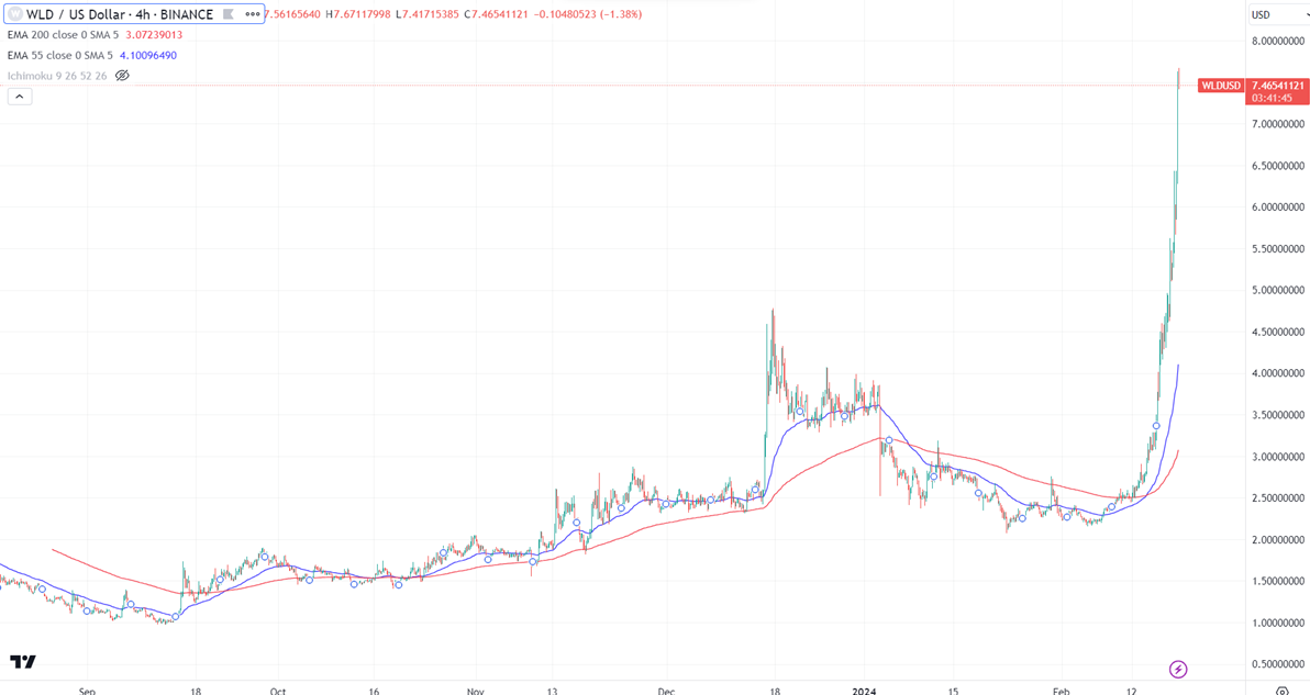 WLDUSD surged more than 275% in the past ten days. week. It hit a high of $7.67 at the time of writing and is currently trading around $7.46.