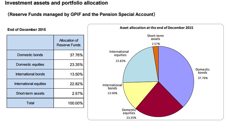 - By third quarter of 2015, GPIF’s holding of bonds were reduced by approx. 14%, while that part went into equities. Now about 46.1% of the total $1.2 trillion portfolio is invested in equities, of which 245 invested in home.