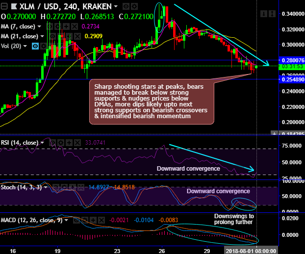 As a result, the price slides below DMAs, for now, further dips seem to be on cards as both leading oscillators signal bearish momentum. Consequently, the bears have managed to break major supports (at 0.280076 levels) after sliding below 21-DMA, abrupt upswings constantly restrained below 7-DMA.