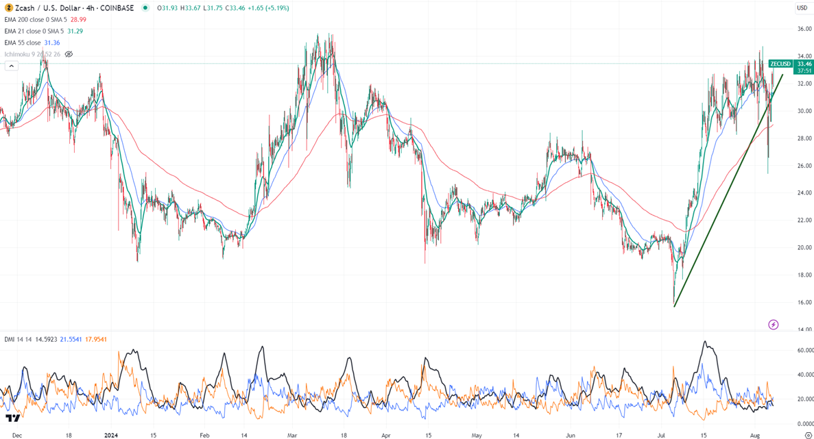 ZECUSD gained more than 30% in the past two days. The pair holds above the short-term (21 and 55 EMA) and the long-term moving average in the 4-hour chart. It hit a high of $33.67 and is currently trading around $33.51.