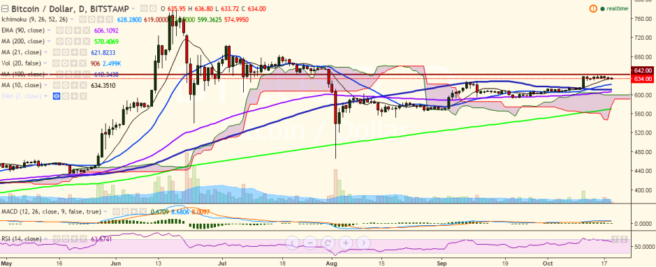 BTC/USD is trading in the red on Wednesday, continuing its gradual downtrend seen from the past few days. It is currently trading at 634 levels at the time of writing (Bitstamp).
