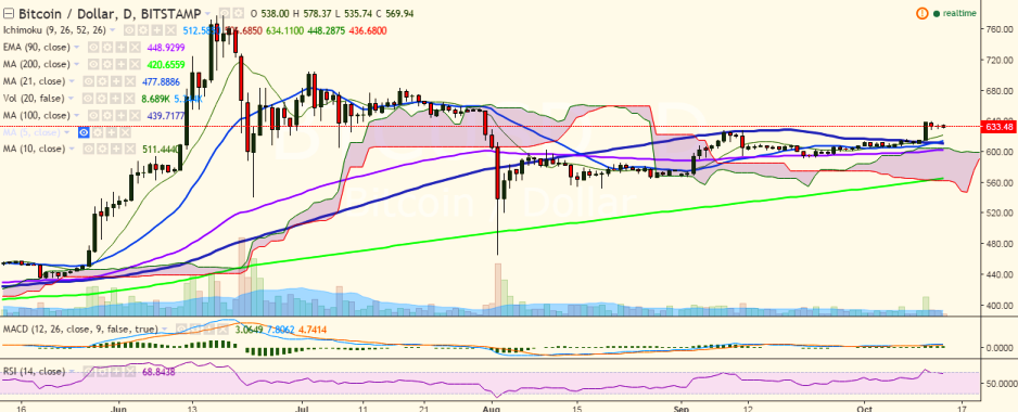 BTC/USD is trading in a narrow range on Friday between 630 and 635 levels. It is currently trading at 634 levels (Bitstamp).
