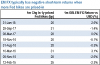 The short-term repricing of Fed hikes is typically not supportive of EM FX returns, which also motivates our selective hedges (e.g. TRY and MXN). The recent research in the past emphasized the distinction between increases...