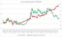 The chart above shows, how the relationship between USD/DKK and 2-year yield spread has unfolded since 2012. It can be seen that the pair and the yield spread between 2-year treasury and 2-year Danish government bond...