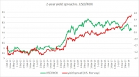 The chart above shows, how the relationship between USD/NOK and 2-year yield spread has unfolded since 2012. It can be seen that the pair and the yield spread between 2-year treasury and 2-year Danish government bond...