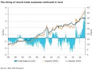 Australias monthly trade balance surged to a new high in June, coming in at a AUD8,036m surplus, the highest on record by some margin. Underlying this was a 1.4 percent m/m rise in exports and a 3.6 percent m/m fall in...
