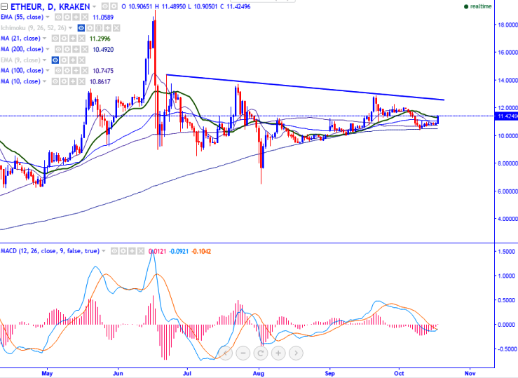 Long-term trend remains to be bullish. ETH/EUR trades slightly above 21- day MA and this confirms minor trend reversal, a jump till 11.95/12.29 is possible.