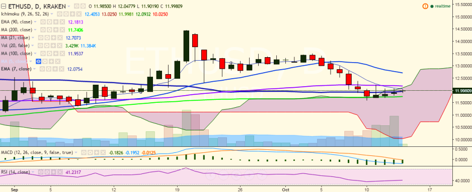 ETH/USD is consolidating gradually in a narrow range and is hovering around 100-day MA. It is currently trading at 11.99 levels (Kraken).