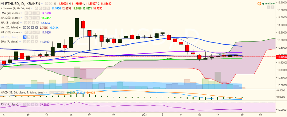 ETH/USD has been trading in a narrow range for the past couple of days and is struggling for a consistent break above 12.00 levels. It is currently trading at 11.88 levels (Kraken).