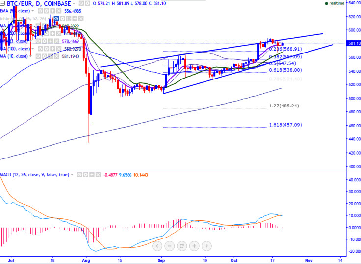 BTC/EUR is seen trading slightly above on Friday. The pair has recovered slightly from the low of 573.0 levels (COINBASE). It is currently trading around 581.77 at the time of writing.