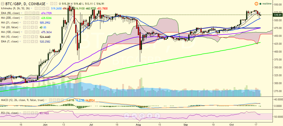 BTC/GBP declined till 505.84 levels on Wednesday before closing at 516.58 levels. Today, the pair is trying to hold its upward strength and is trading at 516.81 levels currently (Coinbase).