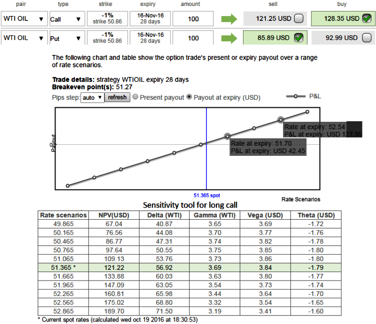 Thus, on hedging grounds we would like to deploy 1M in the money WTI +0.51 delta call option (1% strike) and simultaneously, short an out of the money call (1% strike) of 2W tenor with positive theta or closer to zero.