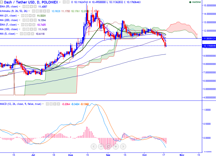 DASH/ USDT pair breaks psychological support at USDT10 and declined till USDT9.94 yesterday (Poloniex). It is currently trading around USDT10.23 at the time of writing.