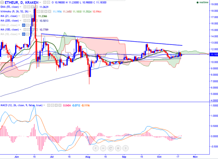 ETH/EUR is seen trading above on Thursday. The pair has slightly retreated after jumping till 11.50 yesterday (KRAKEN). It is currently trading around 11.20 at the time of writing.