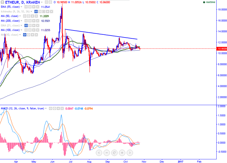 ETH/EUR is seen trading well below in red on Tuesday. The pair has declined sharply today morning and declined till 10.55 levels (KRAKEN). It is currently trading around 10.78 levels at the time of writing.