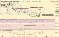 AUD/NZD has retraced from session highs at 1.0741 and is currently trading around 1.0700 levels. The pair has broken major trendline resistance at 1.0500 levels, bias higher. Momentum studies are heavily bullish,...