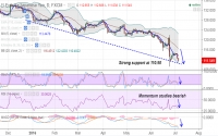 After the pair breaks below support at 0.9238, the current prices well below DMAs, 21DMA crosses-over 7DMA. Major resistance is now seen at 0.9265 (21DMA). Earlier, the pair has bounced up to 0.9307 levels (upper BB)...