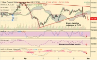 NZD/JPY price action breaks below daily cloud and bias is strongly to the downside. The pair has broken strong trendline support at 75.70 on Thursdays trade. Stochs are biased lower, and 5-DMA is showing a...