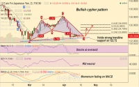 A Bullish Cypher pattern completed on EUR/JPY daily charts. We see weakness only below 122 levels. The pair has also taken strong trendline support at 122.72 on Thursdays trade. Scope for upside test of 125.38...